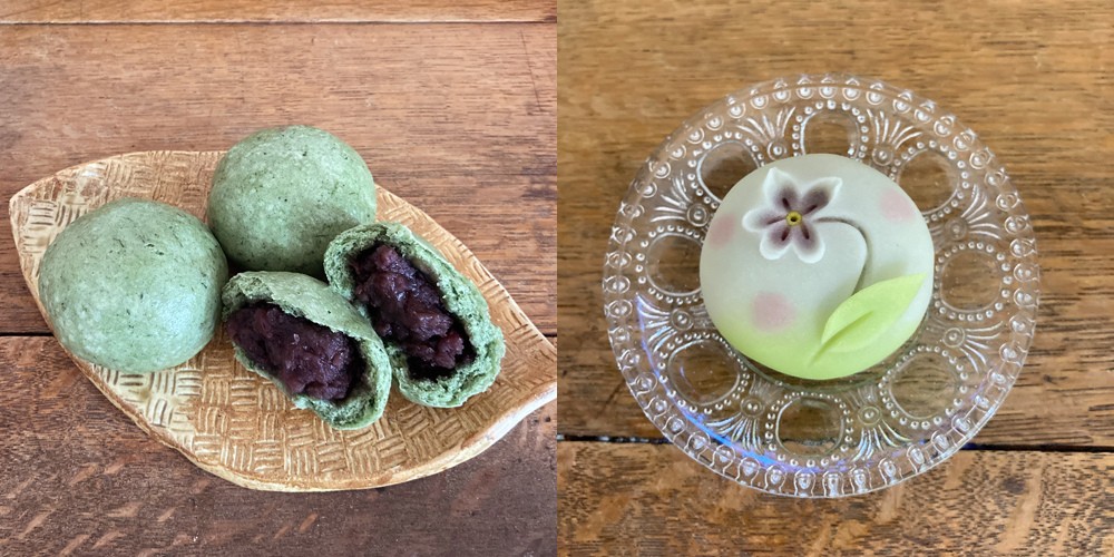 【メニュー:よもぎ饅頭、花菫(練切)】